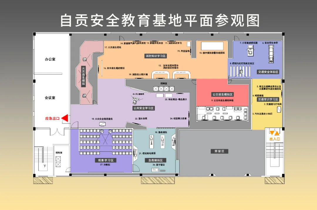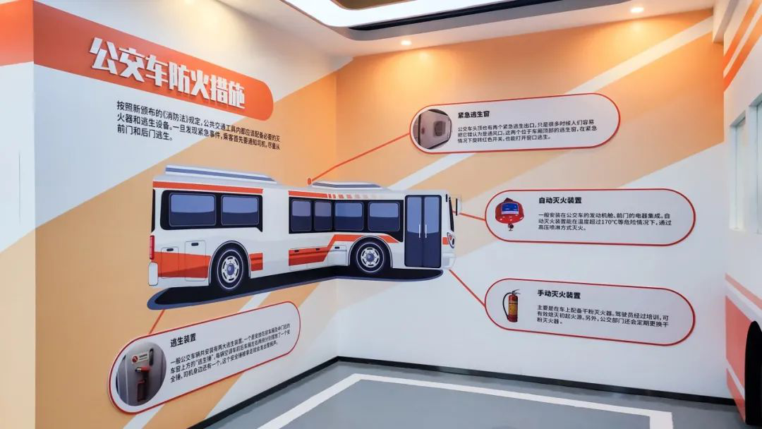 业已落成并启用的教育基地占地面积近900平方米,设有序厅、交通安全常识区、交通安全体验区、公交逃生模拟区、消防知识学习区、火灾逃生模拟体验区、公共安全互动体验区、急救模拟区、3D影院等10个展区。